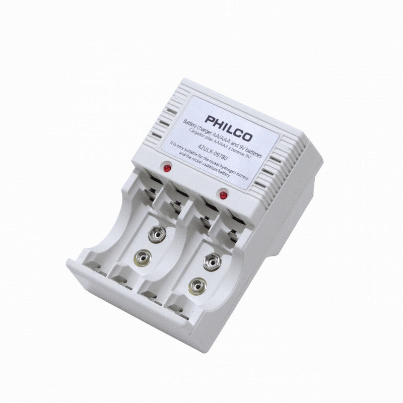 Cargador de pilas con capacidad para cargar 4 pilas al mismo tiempo, modelo 09780 de la marca Philco.