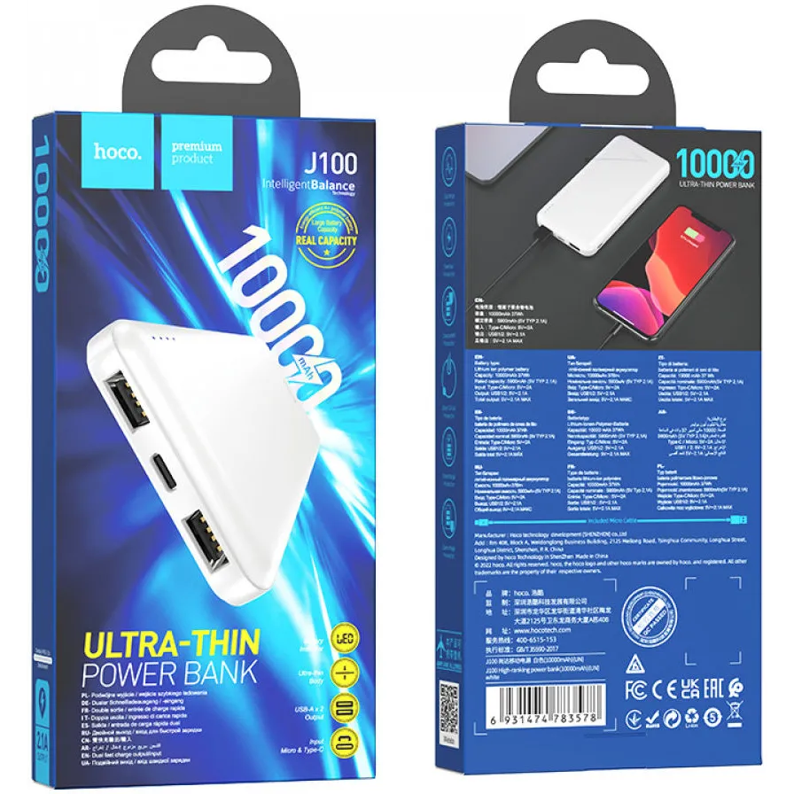 La Power Bank 10000mAh J100 BLANCA es un cargador portátil con capacidad de 10000mAh, ideal para cargar dispositivos electrónicos como smartphones, tablets, reproductores de música, etc. Tamaño compacto y ligero para llevar en tus viajes o en cualquier momento del día.